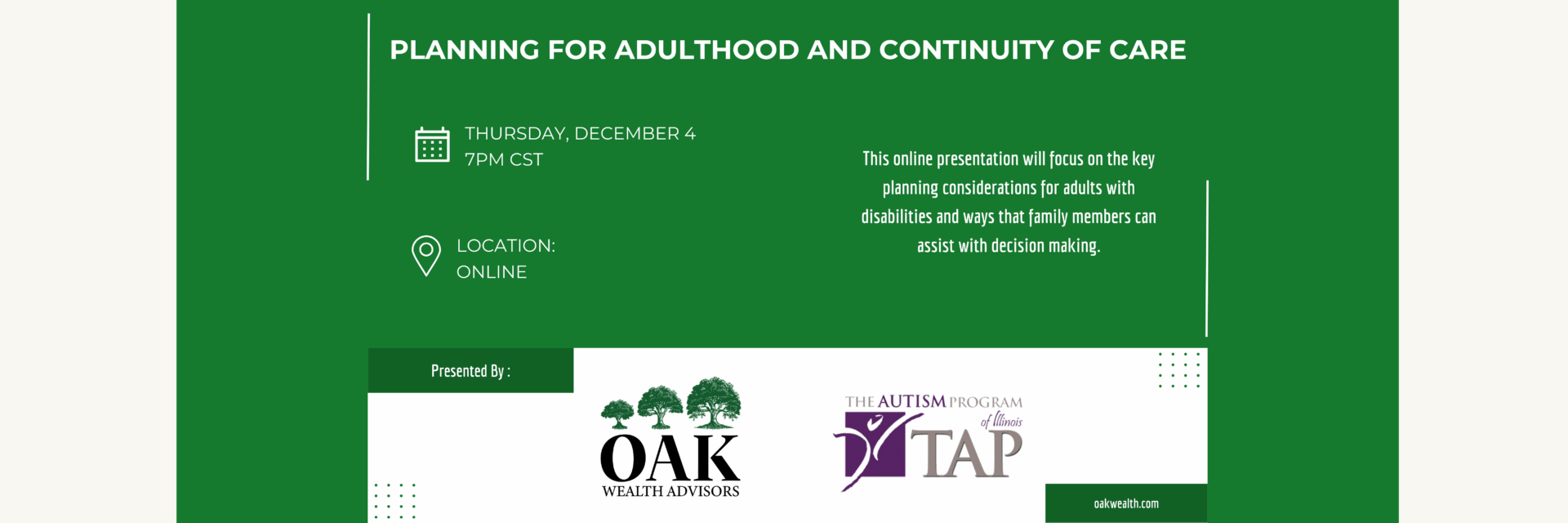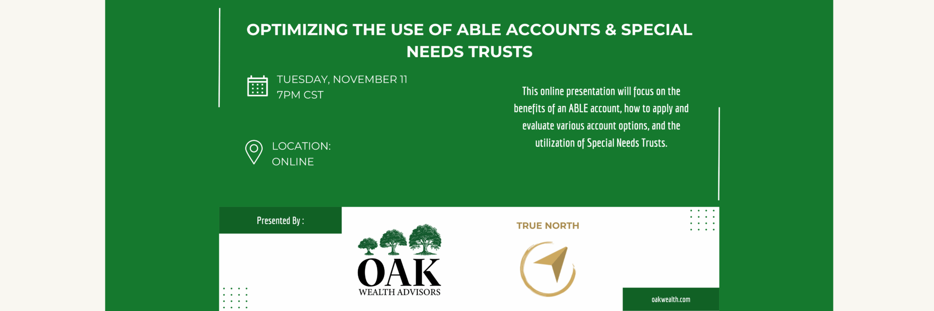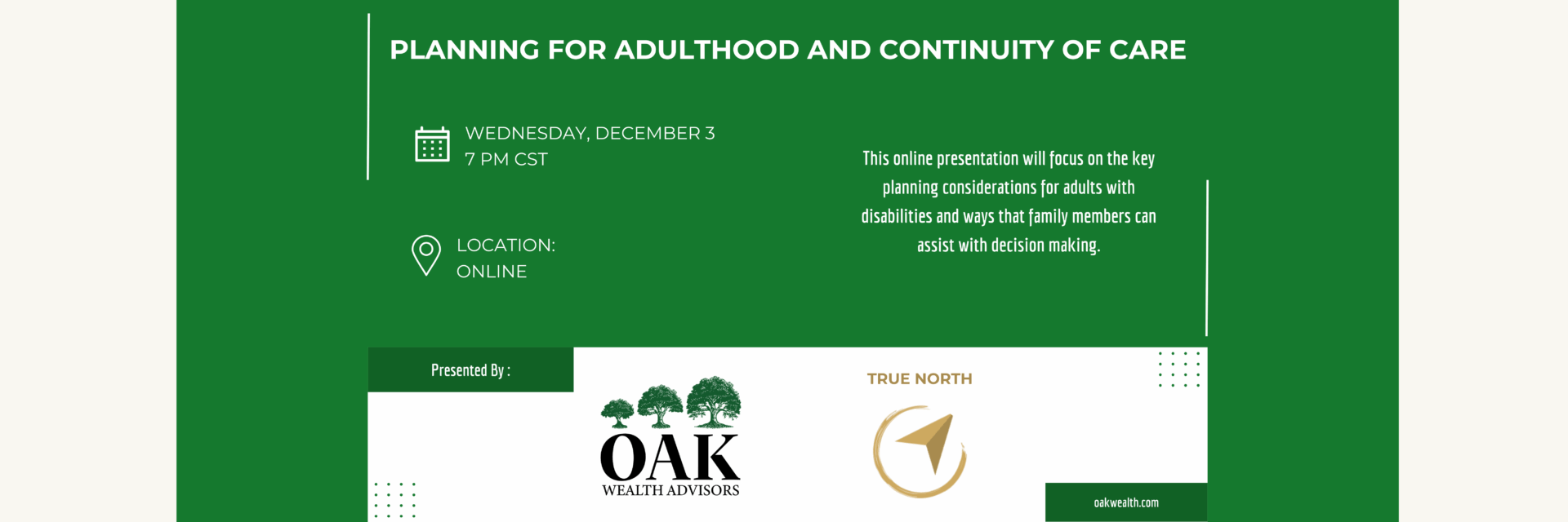 Mike Walther, Founder and President of Oak Wealth Advisors, will be presenting an overview of the major Government Benefits Programs. He will highlight the opportunities for the greatest impact and how to avoid the most common mistakes. This presentation is beneficial for families who are interested in understanding their benefit options and is essential for families with loved ones who are around the magic age of 18.