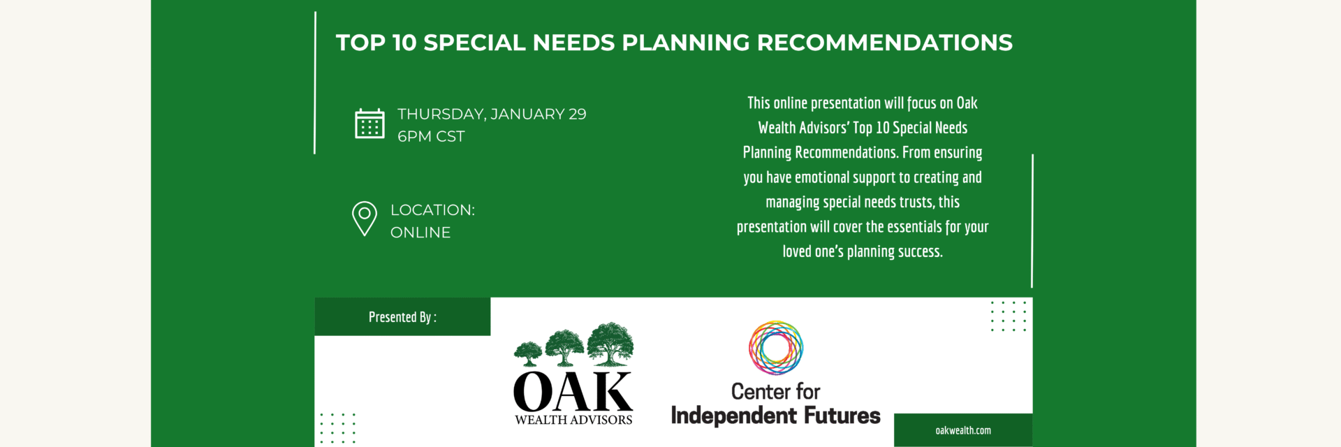 ![]() TOP 10 SPECIAL NEEDS PLANNING RECOMMENDATIONS | CENTER FOR INDEPENDENT FUTURES Please join us for an informational hour with Mike Walther, CPA/PFS, CFP®, CFA®, founder of Oak Wealth Advisors, as we discuss our curated list of Special Needs Financial Planning Tips. Drawn from our decades of experience navigating the special needs community with our […] |