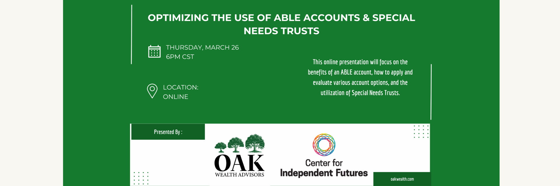 OPTIMIZING ABLE ACCOUNTS & SPECIAL NEEDS TRUSTS | CENTER FOR INDEPENDENT FUTURES Join Mike Walther, CPA/PFS, CFP®, CFA®, founder of Oak Wealth Advisors, for an engaging and informative workshop on ABLE Accounts & Special Needs Trusts, and how to optimize their use. We will explain the benefits of the ABLE Account, and how it […]
